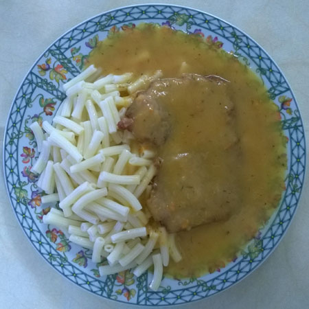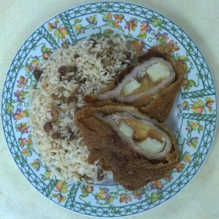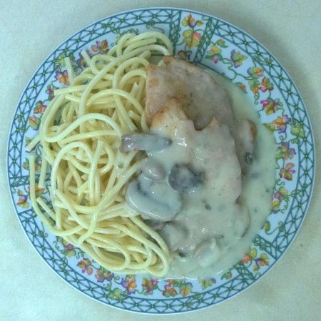 ![]() Füstölt sajttal, almával töltött szelet rántva Mazsolás rizs | ![]() Pácolt csirkemell roston, tejszínes gombamártással, makaróni |